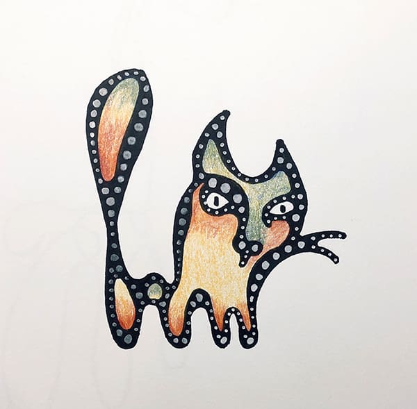 The supplies you’ll need are your sketchbook, colored pencils, black felt pens and a white paint pen.