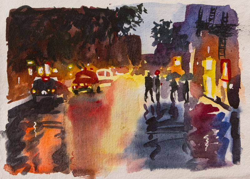The city in the rain at night is a wonderful thing. Let’s paint it and, while we’re at it, let’s make it big! Get your big brushes out, put some of your favorite music on and give yourself permission to think big, take chances and have fun.