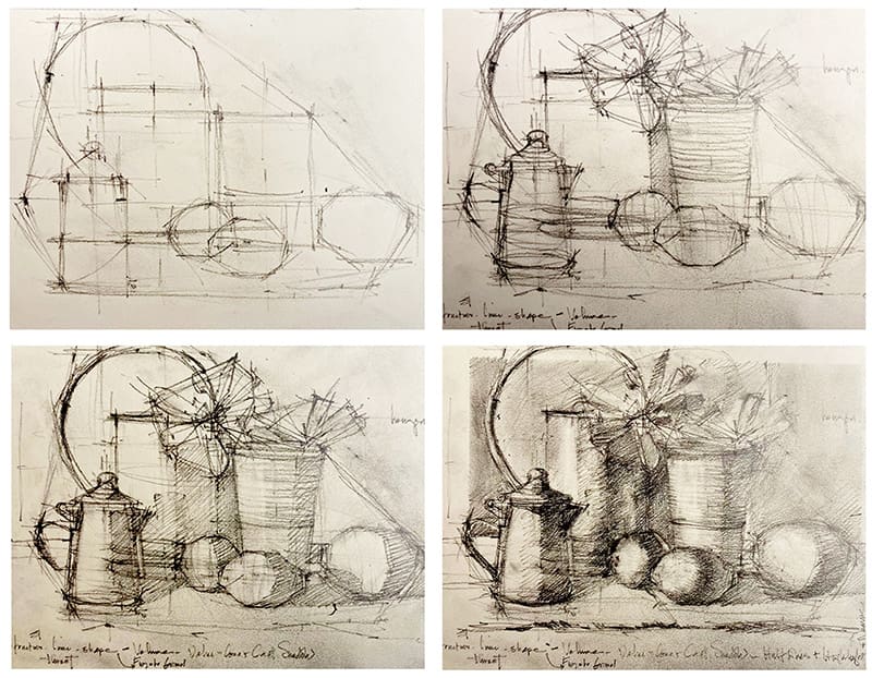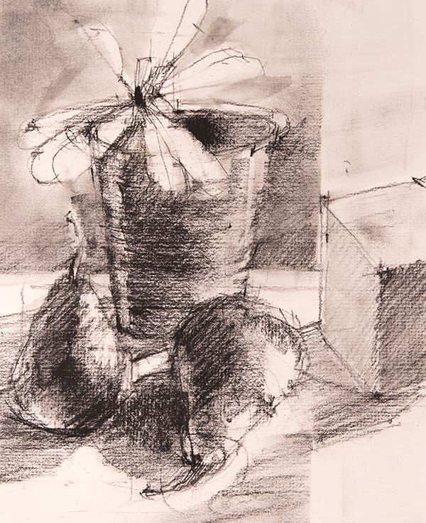 Let’s put all these concepts together: Line, Shape, Volume and Light and continue the process that creates honest drawings, truly drawing ‘what I see, not what I think I see.’ We will draw from a still life and work by describing/depicting by measuring, correcting, searching, and exploring with line.