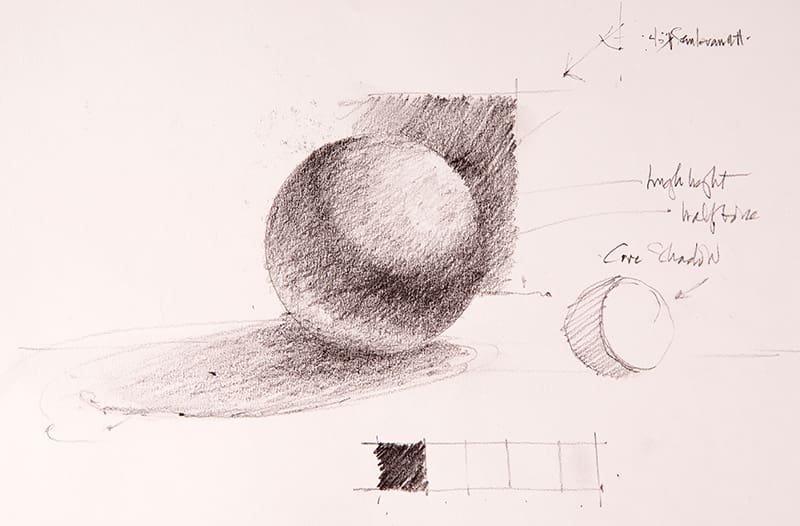 In this exercise we will identify the light form qualities: core shadow, half tone, cast shadow, reflected light, highlight. The assignment will be to create a vine charcoal and a graphite drawing of a sphere with nuance and beauty.