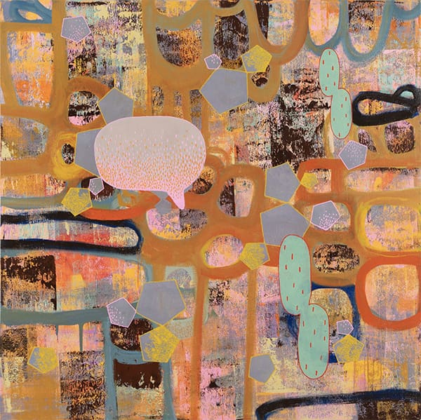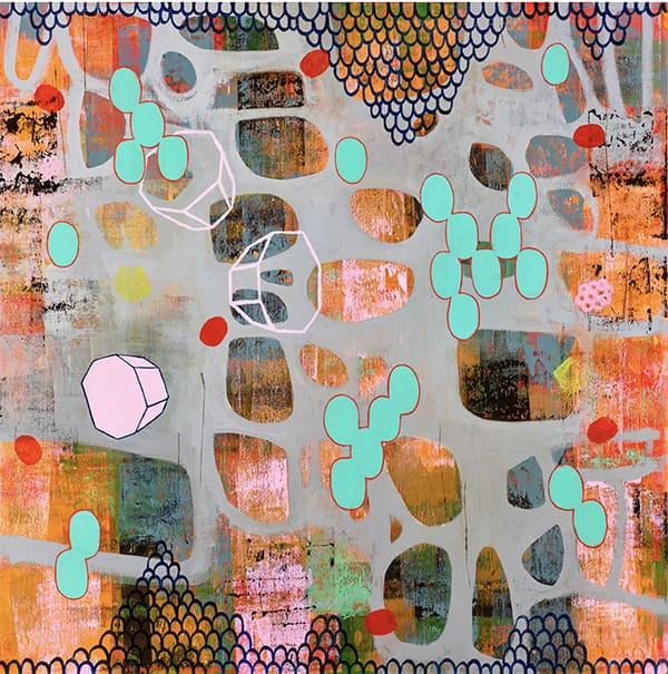 In this class we will use paintbrushes, stencils, and printmaking brayers to build an acrylic painting that explores the space between layers. We will start with bright colors and then add multiple layers of brayer work. I’ll guide you through the fun (and challenging!) process of selecting windows and making shapes to hold our discoveries. Accidental color combinations guide us though each step as we add more complexity and detail.