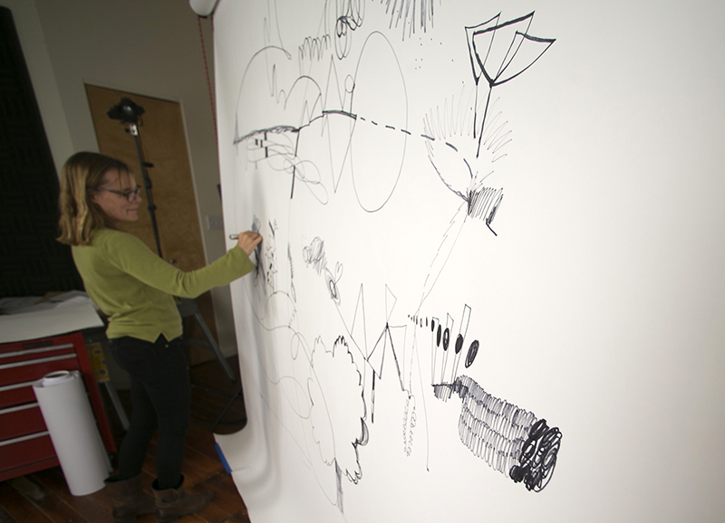 Place large sheets of paper on a wall or a door. This will enable you to work using your whole body. Use a variety of sharpies to create a huge sized doodle.