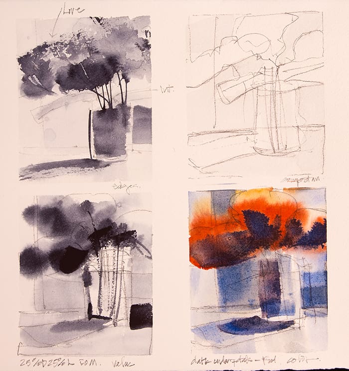 Now we will combine these past six lessons and paint a still life, an easy set-up with simple shapes: I used flowers and a vase on a table. We’ll start with a watercolor variable study and divide our paper into the four separate design fields. Label each and begin the process of breaking down in diagram the checklist of watercolor concepts: Wetness/Edges, Composition, Value and Color. Then we will put it all together for your final painting.